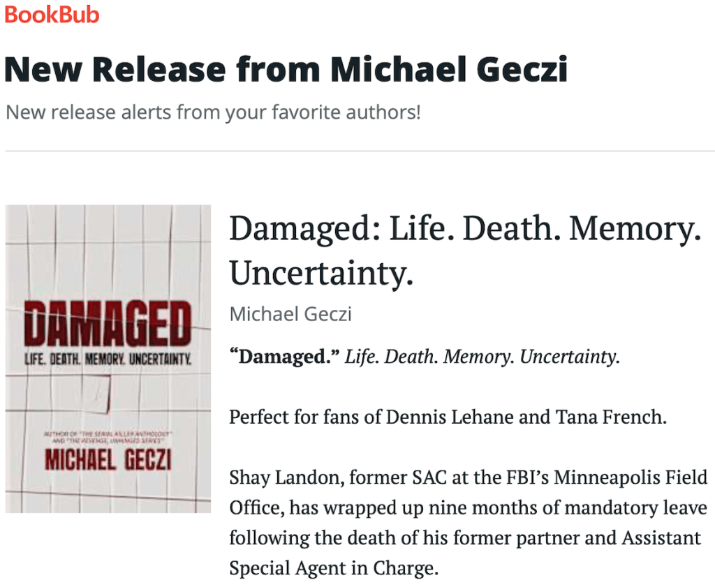 The first is the New Release Update that BookBub issued about my latest book, “Damaged,” which launched recently. If you are a fan of “Shutter Island,” “Fight Club,” or “Gone Girl,” this might be a read for you. You can check it out by clicking the button below the graphic.